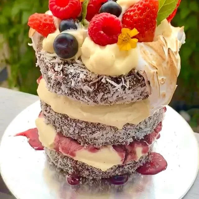 Sweet grazing option includes all housemade patisserie style items including mini lemon meringue tarts, brownies (gf), cupcakes, macaroons (gf), mini signature lamingtons, chocolate bark, selection of seasonal fruit & dried fruit